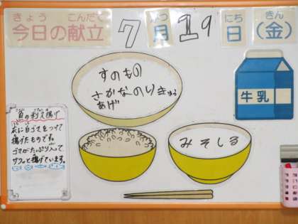 今日の献立は、ごはん、牛乳、魚の利休揚げ、酢の物、みそ汁です。