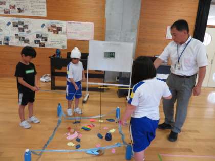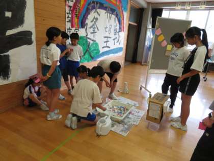 「おみくじ」「わにわにパニック」「きんぎょすくい」「しゃてき」「さかなつり」の5つのコーナーがありました。それぞれのコーナーは、子供たちが自分で決め、アイディアを盛り込んで製作したものばかりです。また、他の学年を招待して、ゲームの仕方を説明したり時間を計ったりするなど、お店の仕事も生き生きと行いました。1年生のおかげで楽しい時間を過ごすことができた、2年生以上の子供たちと教職員です。