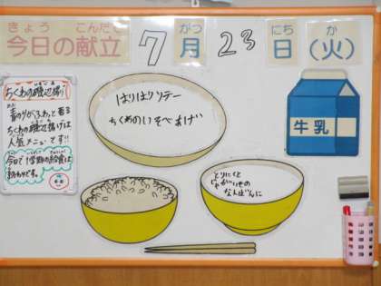 今日の献立は、ごはん、牛乳、ちくわの磯辺揚げ、はりはりソテー、鶏肉とじゃがいもの南蛮煮です。