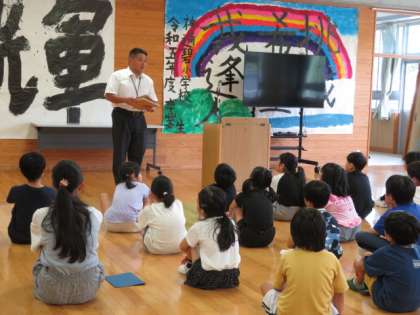 教頭からは、熱中症対策についての話でした。1 マスクの使い方に注意する。2 雨傘を日傘として代用してもよい。3 ランドセルにこだわらず、軽量で通気性のよいリュックを使ってもよい。という内容でした。自分の体を守るためにも、子供たちが的確に判断できるように支援していきます。