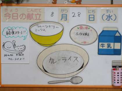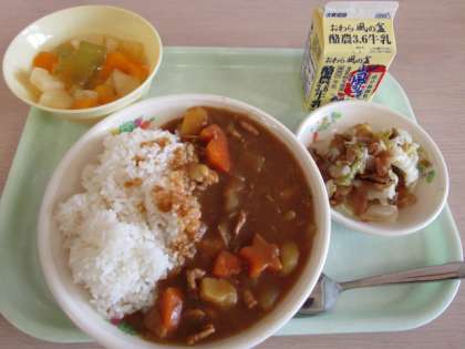 今日の献立は、カレーライス、牛乳、福神和え、フルーツゼリーミックスです。