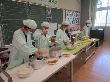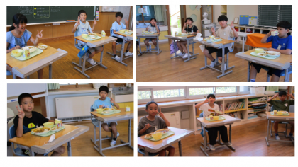 「やったあ!今日はカレーライスだ!!」2学期、最初の給食はカレーライスでした。久々にみんなで輪になり、会話を楽しみながらもりもりと完食しました。給食準備、片付けも自分達で進んで取り組むことができる、すてきな4年生です。
