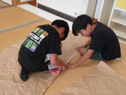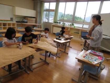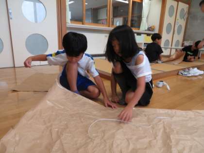 今日は、大きな1枚の紙を袋状に貼り合わせる作業です。友達と2人組になって協力しながら作業を進めていきます。4人とも作業の内容をしっかりと聞いて、大きな袋を作り上げました。協力することや細かな作業をすること等、さすが2年生と思う仕上がりでした。