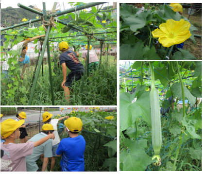 4時間目の理科の学習で、碧っ子農園の中で育てているヘチマを観察しました。子供たちは、大きくなったヘチマを見て、その生命力に驚いていました。