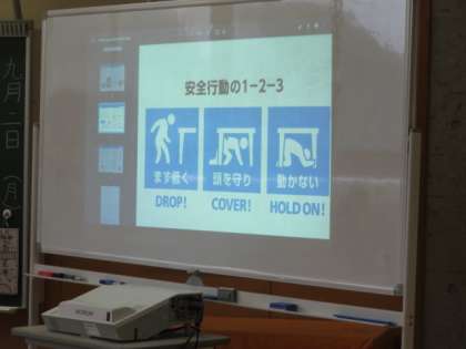 安全確保行動とは、「まず低く、頭を守り、動かない」ということです。訓練を終えた後は、各学級で振り返りを行い、防災に対する意識を高めようと真剣に取り組んでいました。