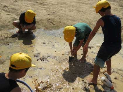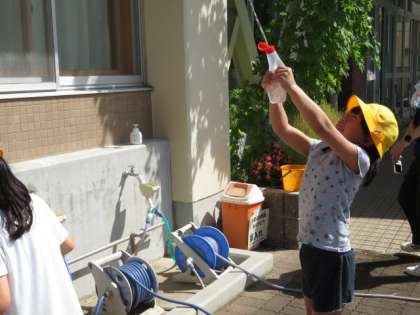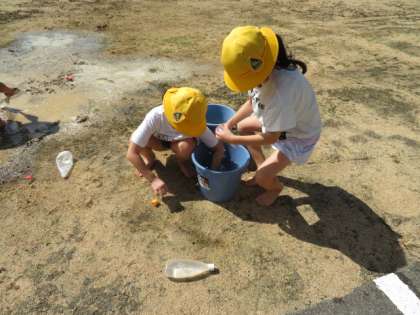 水だけでなく泥遊びに発展させたり、水の飛ばし合いをしたりと、子供たちは自分たちの発想を生かして楽しみました。