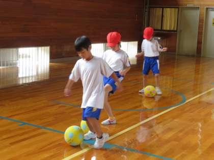 次は、ドリブルをしながら体育館1周しました。細かく蹴りながら前に進むよう真剣に取り組んでいました。
