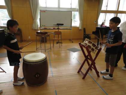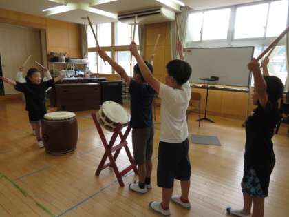 今日は、和太鼓を使ってリズム打ちを行いました。慣れてきたところで、ピアノの音に合わせてリズムを打ちました。全員で勇ましいかけ声をして終了です。