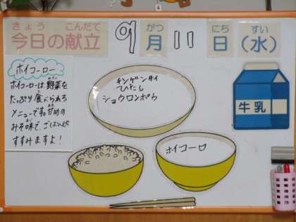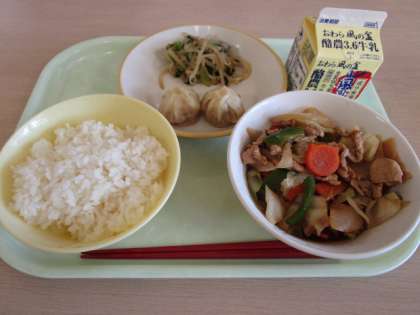 今日の献立は、ごはん、牛乳、小籠包、チンゲンサイひたし、回鍋肉です。