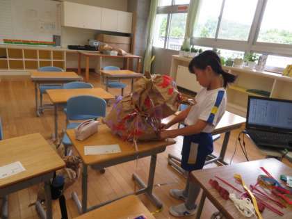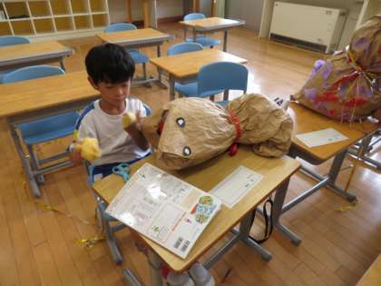 「ぐしゃぐしゃ ぎゅ」では、大きな袋の中に丸めた新聞紙を詰め込み、自分のつくりたい物を製作してます。