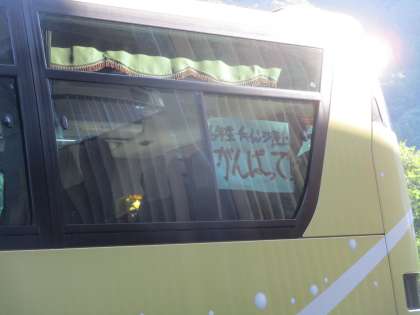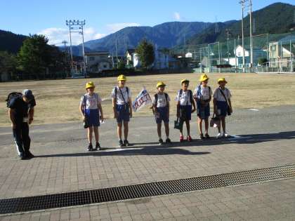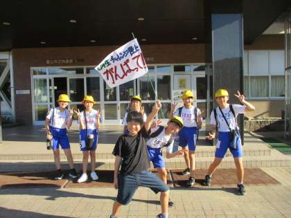 晴天の中、小学校の玄関から6年生が大会会場へ出発しようとしたそのときです。自ら進んで代表となり、応援しにきてくれた5年生Aさんの姿が!心からの笑顔で出発することができた6年生。きっと、大会本番で力を出し切ることでしょう。