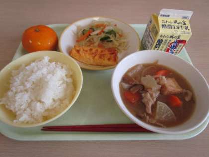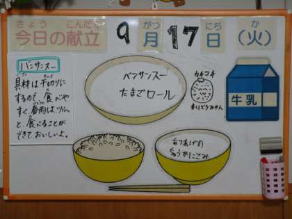 今日の献立は、ごはん、牛乳、卵ロール、バンサンスー、厚揚げの中華煮込み、冷凍みかんです。
