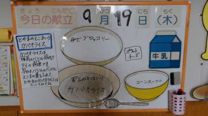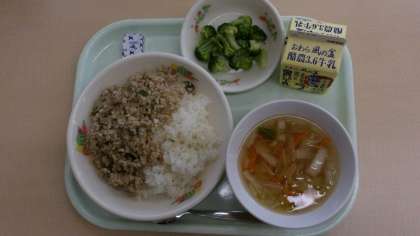 今日の献立は、ごはん、牛乳、とやまのえごまいりガパオライス、ゆでブロッコリー、コーンスープ、ポケットチーズです。