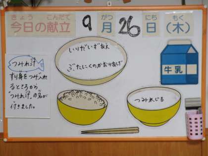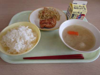 今日の献立は、ごはん、牛乳、豚肉の香り揚げ、いり大豆和え、つみれ汁です。