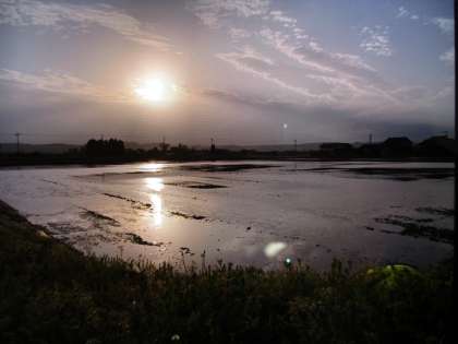 水が入った田んぼに夕日がうつってきらきらしているのがすてきだなと思いました。