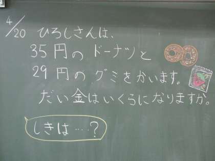4月20日(月) 2年生のみなさんへ1 公開日 2020/04/20 更新日 2020/04/20 2年生の部屋 2年生のみなさん、こえにだして読みましょう。 ひろしさんは 35円の ドーナツと 29円の グミを かいます。 だい金は いくらに なりますか。 さて、このもんだいを とく しきは どうなりますか。