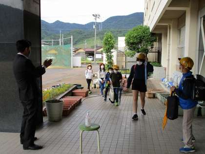 みんな、玄関前で手を消毒してから校舎に入ります。