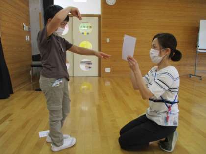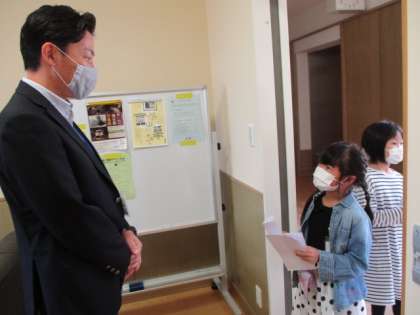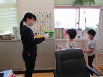 先生方から自己紹介カードをもらってとても嬉しそうな1年生です。