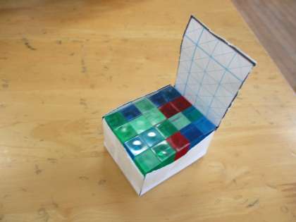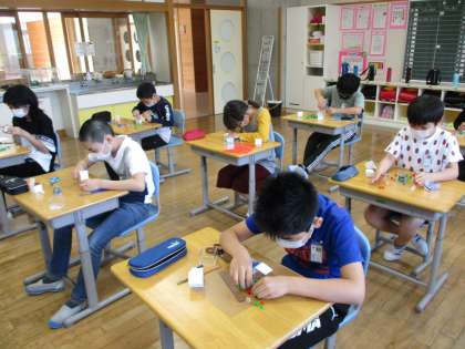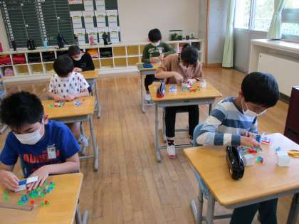 今日の算数科の学習は、直方体と立方体のかさを比べました。1辺が1センチメートルの立方体を使うとかさを調べることができそうだと考えて、実際に直方体と立方体に1辺が1センチメートルの立方体敷き詰めました。