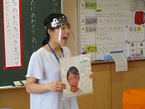1年生教室では、国語科の学習時に担任がフェイスシールドを着用しながら音読をすることで、子供たちが口の形に着目できるような工夫をしていました。