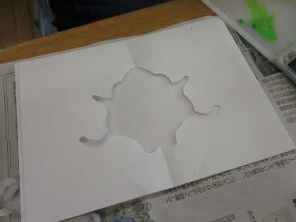 スパッタリングでは、画用紙に型を置き、絵の具をつけたブラシで網をこするとおもしろい模様が浮かび上がります。芸術的な模様です。