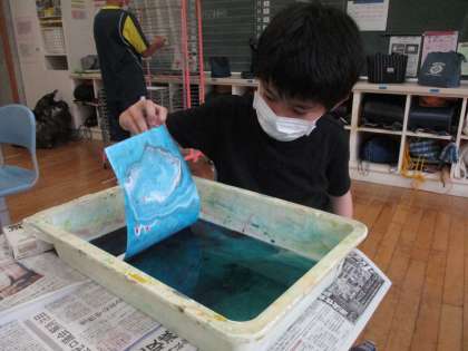 マーブリングは、紙をめくってみるまでどんな模様になるか分からないのでドキドキです。
