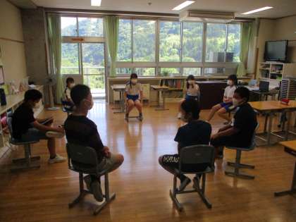 今日のコミュニケーションの時間は「ぱちぱちセブンゲーム」をしました。このゲームのルールは、はじめの人から順番に1から数字を言い、7の倍数と7がつく数字の時は手をパチンとたたき数字を言い進めるゲームです。来週は「ハンカチ落とし」をする予定です。