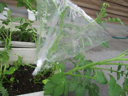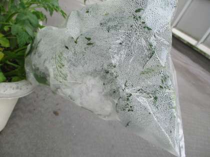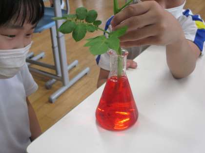 植物は根から水をどのようにして全体へ運んでいるのか確かめるために実験を行いました。育てていたジャガイモを掘り起こし、根についた土を洗い流し、染色液につけました。明日、ジャガイモの茎の中を観察します。そして、葉の部分に水が運ばれているのか確かめるために、葉がついたものと葉を取ったものに袋をかぶせて数時間後に観察しました。すると、葉がついた袋にはたくさんの水滴がついていました。