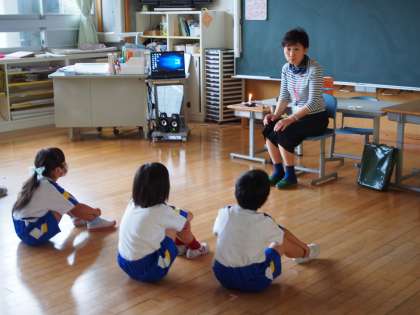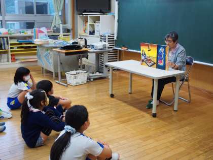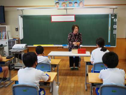3年生の教室では、細入地区に伝わる昔話を手作りの紙芝居で話していただきました。