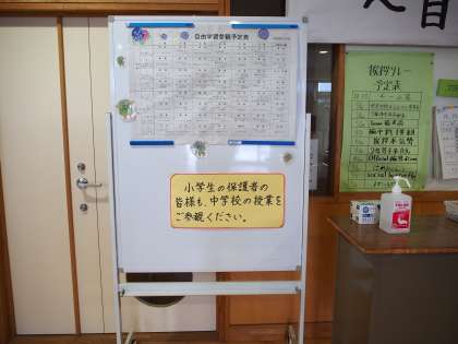 玄関を入ったところに、受付がありますので、名簿に記入して、名札をつけてお入りください。