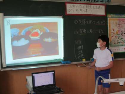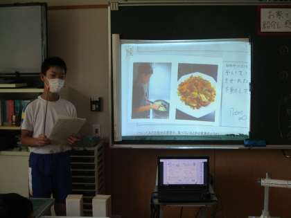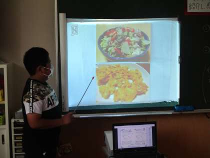 自分の家で朝食作りに挑戦しました。学校で決めた約束は、1.野菜を炒めること、2.栄養のバランスを考えて作ること、以上の2点です。子供たちそれぞれの朝食に個性があってどれも美味しそうでした。