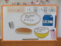 今日の給食のメニューに、ベーコンとゴーヤの卵炒め、シューアイスが出ています。