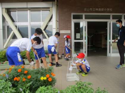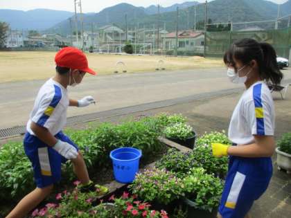 花の苗を植えた時にもお世話になった6年生の皆さんに、今度は草むしりや花摘みの仕方を学ぶ1年生です。優しく教えてもらい、花壇もすっかりきれいになりました。