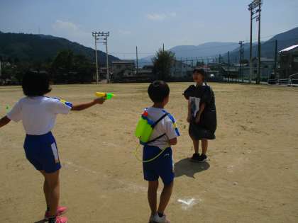 昼休みに水鉄砲鬼ごっこをしました。5年生でルールを考え、習字の半紙が水に濡れて破けないように逃げました。今日はとても暑かったので、冷たい水が気持ちよかったです。