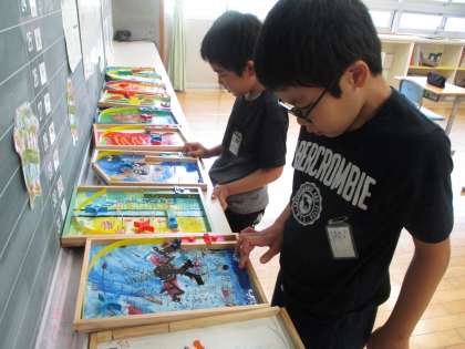 1学期の図画工作の時間に作ったコリントゲームで遊んでいます。