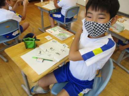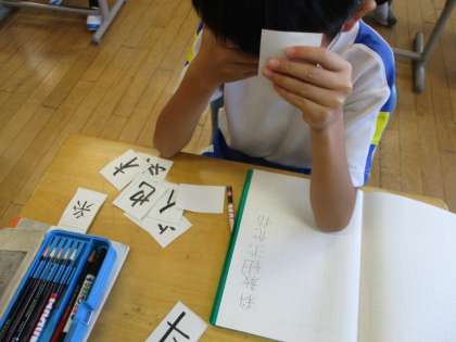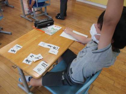 2枚のカードを組み合わせて、これまでに習った漢字をノートに書きました。