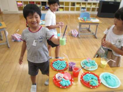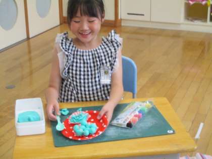 みんなで食べたいものを話し合い、粘土を使って作っています。