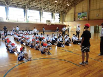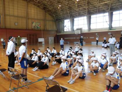 小中学校それぞれの実行委員長が、体育大会を振り返り、感想を述べました。その後、各団に分かれて、団長が団の健闘をたたえるとともに、来年の体育大会に向けての思いを団員に伝えていました。