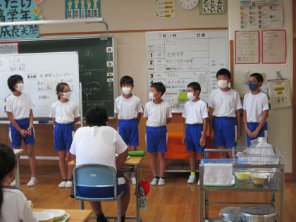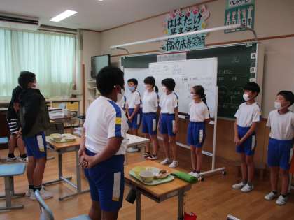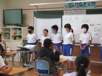 先日の体育大会では、6年生を中心に団をまとめてどちらの団もすばらしい応援合戦をしていました。子供たちは6年生に感謝の気持ちを送りたいと願い、6年生教室へ訪問しました。「大声でみんなをまとめる6年生がかっこよかった」「来年は私たち僕たちががんばる」という気持ちを伝えることができました。