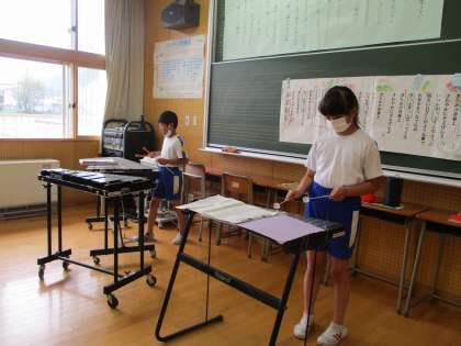 木琴、トライアングル、カスタネット、リコーダー等それぞれ違う楽器を担当しています。