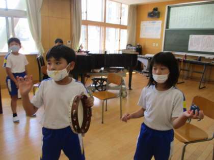 タイミングを合わせたり、友達が鳴らす楽器の音を聞きながら歌ったりして、アンサンブルを楽しんでいました。