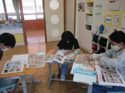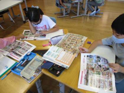 「自分がスーパーで働くなら、どうやってお客さんをふやそうかな」と、班で協力して、たくさんの工夫を書き出していました。