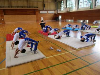 ウォーミングアップでは、側方倒立回転につながる動きの練習をしました。