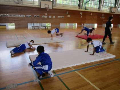 3、4年生は体育でマット運動をしています。