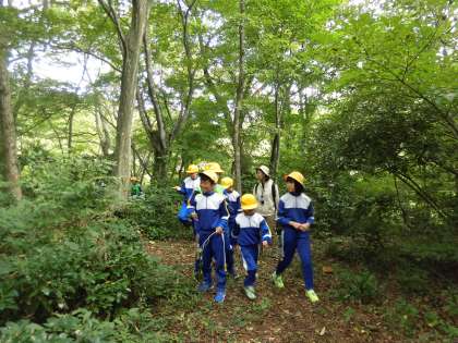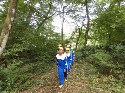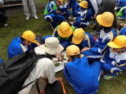 2つ目のゲームは、「葉っぱコレクション」です。グループごとに森に入って落ち葉を集めます。できるだけいろんな種類の落ち葉をさがしてきます。その後に、集めてきた葉っぱを紹介し合って、同じ葉っぱを集めた人で集まりました。なんと、15種類以上の葉っぱを集めてきたグループがいました。