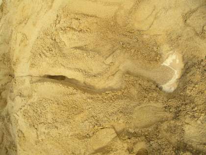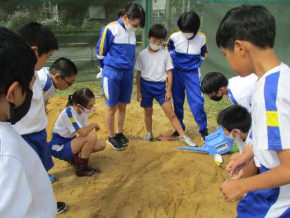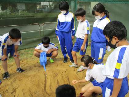 もう少し流れる水のはたらきを調べたいと思い、グラウンドの砂でも実験を行いました。砂が削られているところは水が流れている部分、砂がたまっているところは下の部分だと分かりました。