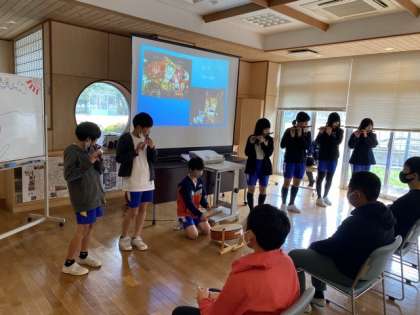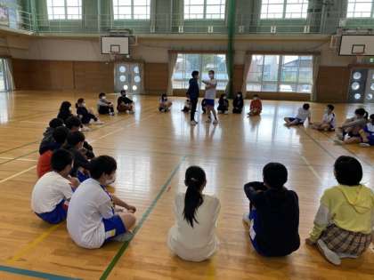 岩瀬小学校の6年生と交流しています。お互いの学校紹介をしたあと、体育館で、ジャンケン列車をして交流を深めました。
