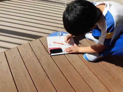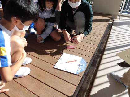 今日は朝から天気がよかったので、太陽とかげの動きを調べました。一時間ごとにチェックする大変な観察なのですが、どんどんかげの場所や長さが変わっていく様子に楽しみながら観察を続けています。