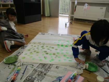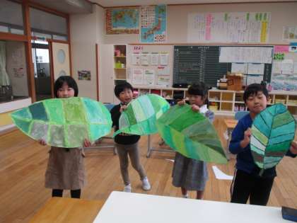 10月19日(月) 1年生 葉っぱを作ろう 公開日 2020/10/19 更新日 2020/10/19 1年生の部屋 図工の時間に葉っぱを作っています。たくさんの種類の緑色を作り、きれいに塗りました。大きな紙にはスタンプを使って、遠くに見える森を表現しました。 これらは学習発表会の劇に使います。それぞれのオリジナル葉っぱができあがり、嬉しそうな子供たちです。