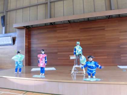 1年生は、音楽劇「やくそく」の練習をステージで行いました。
